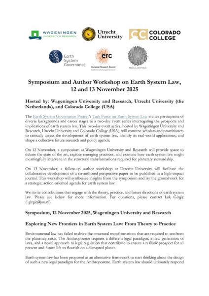 We are pleased to announce the upcoming Symposium and Author Workshop on Earth System Law, hosted by Wageningen University and Research, Utrecht University, and Colorado College this November 12-13.